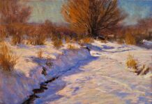 Fortunately, I’m in good health and don’t have many limitations as far as outdoor painting is concerned. Still, I can’t hike as far or carry as much stuff as I used to, so I often seek out good subjects closer to where I can park my car. And although I like to work standing up in the field, I carry my supplies in a trolley with wheels that also turns into a chair for times I need to sit down. The best advice I can give is to try to stay healthy and strong so you can keep enjoying plein air painting for many years to come!