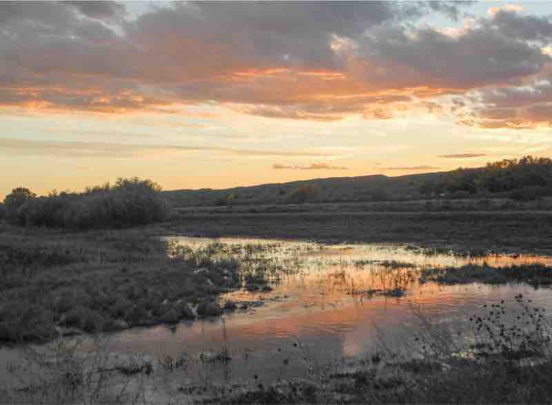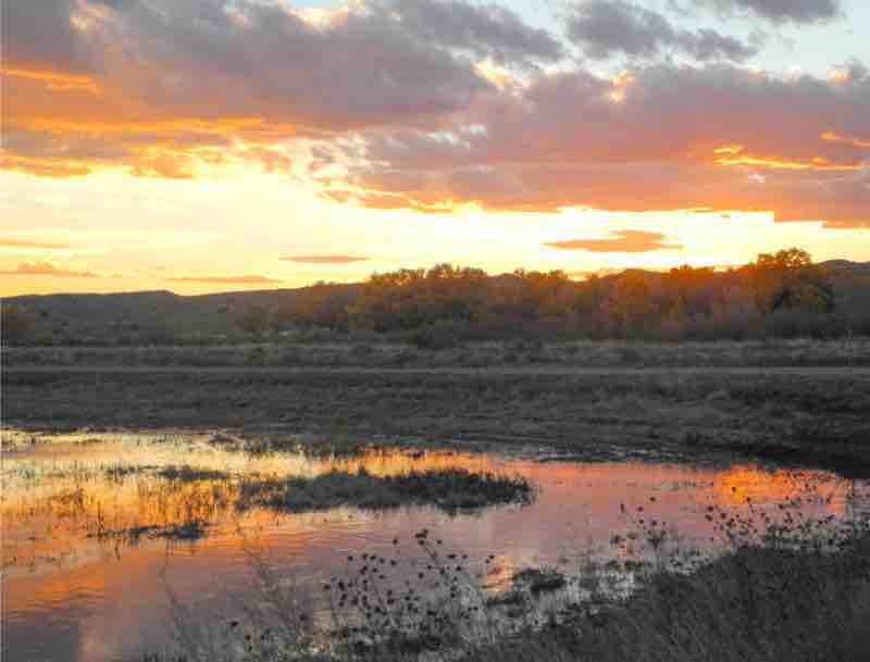 I spend a lot of time painting in the Bosque del Apache Wildlife Refuge, so I know how quickly a scene can change. To be ready for the sunset, I choose my painting location the day before and allow myself ample time to set up. The abstract colors and patterns of the clouds’ reflections in the water grab my attention so I choose to make this the focus of my study. The second photo (below) demonstrates how the light changes dramatically as the sunset evolves. I opt to stick with the diffused light that I saw at the beginning of the sunset, even though more vibrant light and colors continue to emerge.