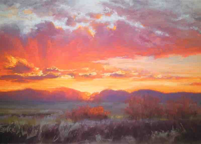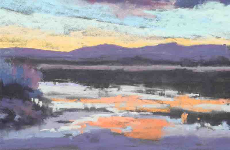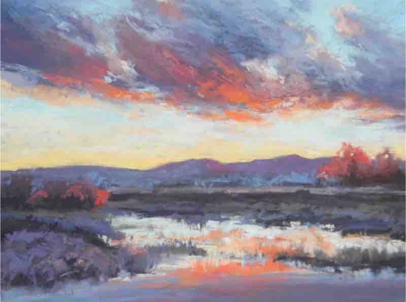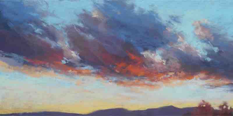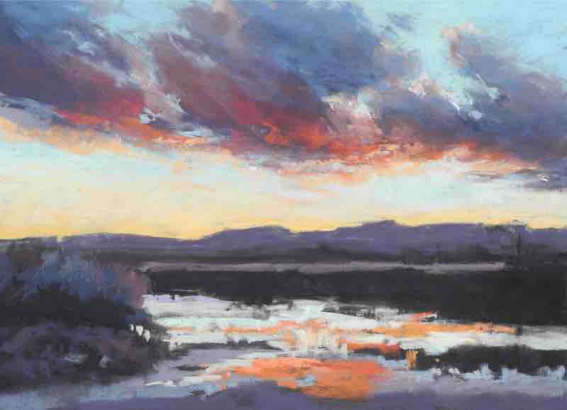 As I build up layers in the cloud forms, I move quickly and allow my energy to be expressed through my mark making. I weave the background sky color in between the cloud forms so that the clouds are an integrated part of the sky, then finish up with the brighter accents of colors. I don’t worry about the details in the earth plane as it’s more important to focus on capturing the excitement of the sky and its unfolding reflections.