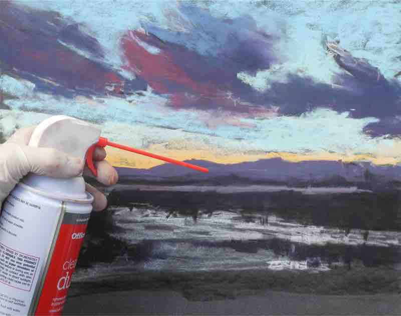 Pastel dust sometimes falls to the bottom of the painting, muddying the colors and filling up the paper’s tooth. If this happens, I use canned air to blow off the excess particles so that the surface can receive clean layers of pastels.