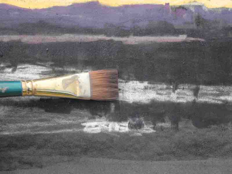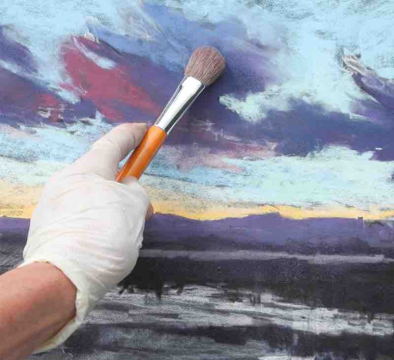 I like to use brushes to manipulate the pastel on the paper. A soft round works for softening and pushing the pastel into the surface, or for gently merging layers together. Flats can be used to create brush marks, as well as soften edges. One advantage of using this paper is its smooth surface, which can hold many layers of pastel without beating up the brushes. Once several layers are built up, the pastel can be pushed around like paint.