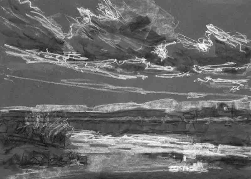 Because the sky changes so quickly, I don’t take the time to work out an overly detailed value study in a sketchbook. Instead, I use four values of Prismacolor NuPastels — black, white, 219-P, and 239-P — to work out a basic value and composition sketch directly on my pastel paper. I always work on a dark paper (Clairefontaine Pastelmat in anthracite), as I appreciate seeing the richness and subtle undertones of pure pigment on dark paper. Because it’s only a sketch, I’m not concerned with it being perfect. I use it as an opportunity to note the interesting shapes, patterns, and value shifts before the light changes. At the same time, I make a mental note of the overall mood that I want to convey. The value sketch and my memory will help me stay focused throughout the study.