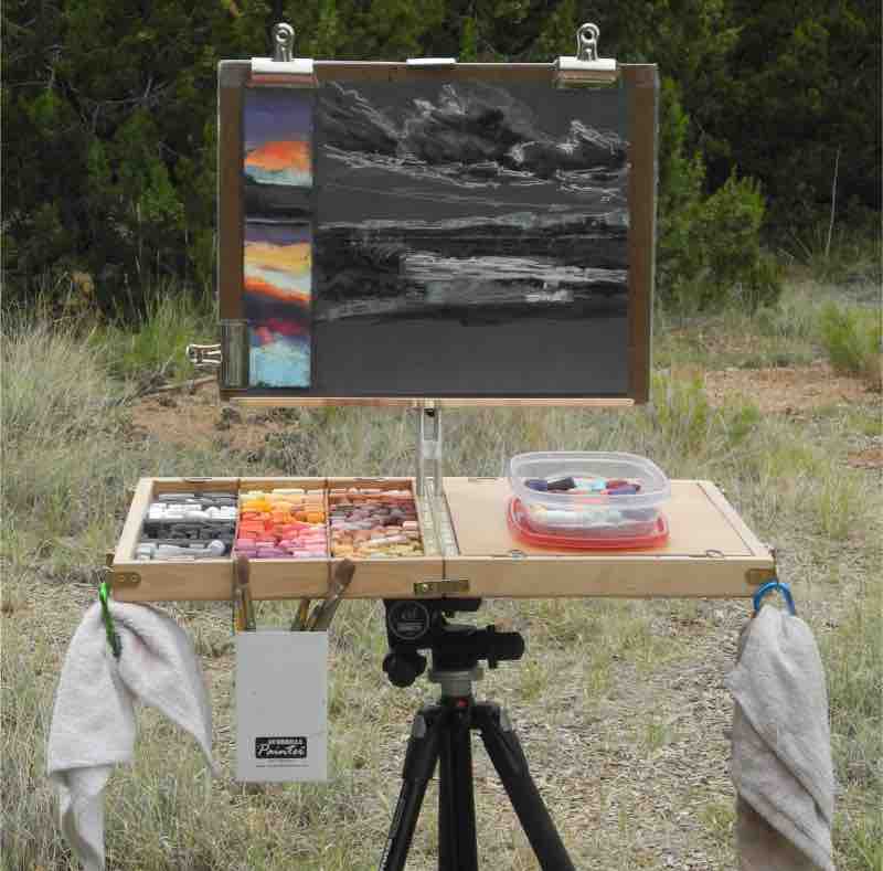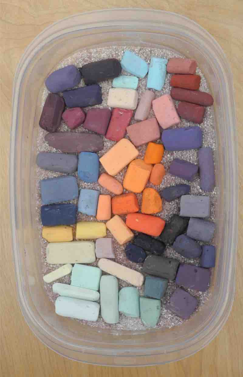I select a palette of colors, then work quickly in space I left to the side of my value sketch to create a harmonious color story that connects the sky and earth planes — again, I work directly on my pastel paper. (I’ve also left space along the bottom for testing colors and marks in following stages.) I start with strong colors for the first layers, knowing that as I build layers my colors will become more subtle. I try to imagine the colors that are behind what I am actually seeing and build those big shape colors back to front. I also consider the colors that are in the sky and how they impact the earth plane. I gather the selected pastels into a small Rubbermaid container and arrange them in the order that I am going to apply them. Corn grits keep the pastels clean and protected. When it’s time to go home, I tuck the container into my backpack and the colors are ready to go when I return to the piece back in my studio.