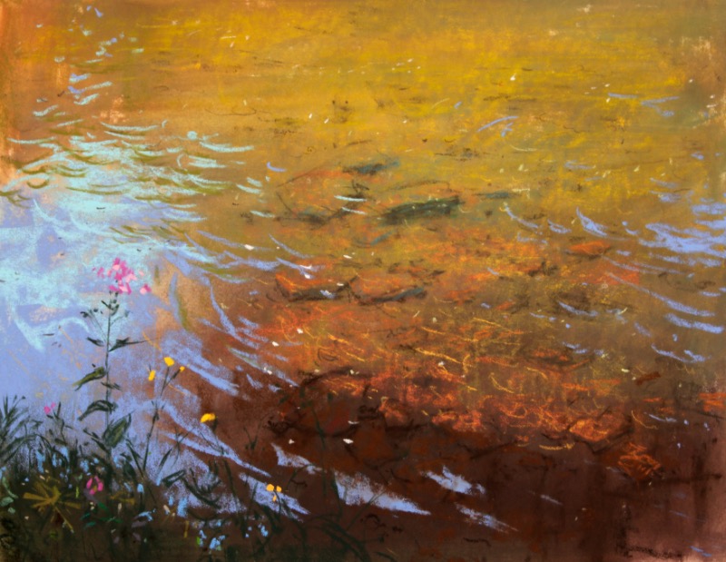“I painted this piece outdoors, using my pastel pochade box mounted on a tripod. My plein air box included roughly 250 half pastel sticks, just enough to get a decent palette but light enough to make it portable. My go-to surface is a Pastelmat by Clairefontaine. I laid in a rough tonal underpainting in harder pastel and then I wet it down, not using water and brushes but instead using a baby wet wipes. They act very much like a brush that turns pastel into a watercolor-like wash. In couple of minutes, the wash dried and then I began to put down accurate color with very soft pressure. I don’t layer much and I try to achieve the final painting effect with as minimal amount of strokes as possible.”