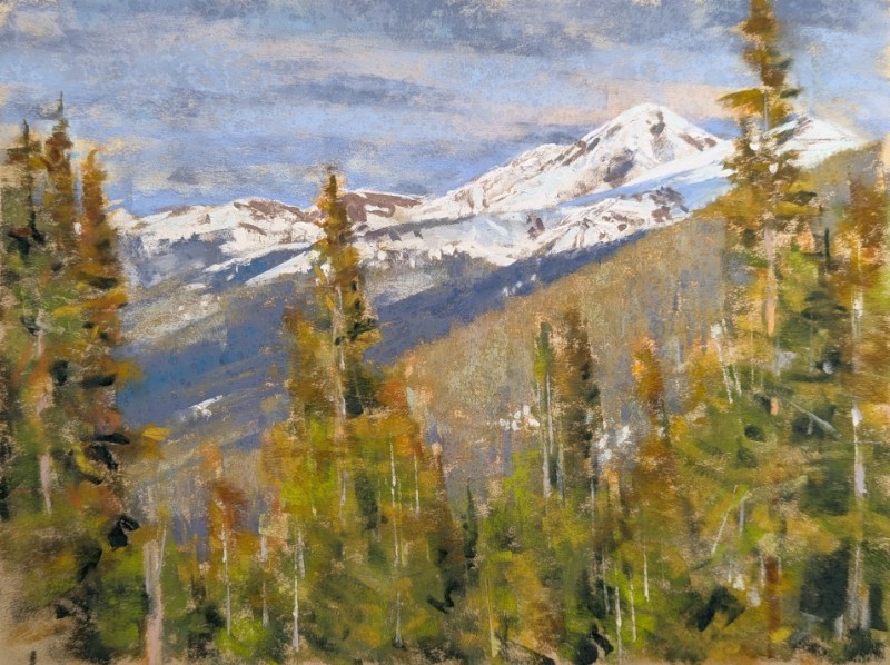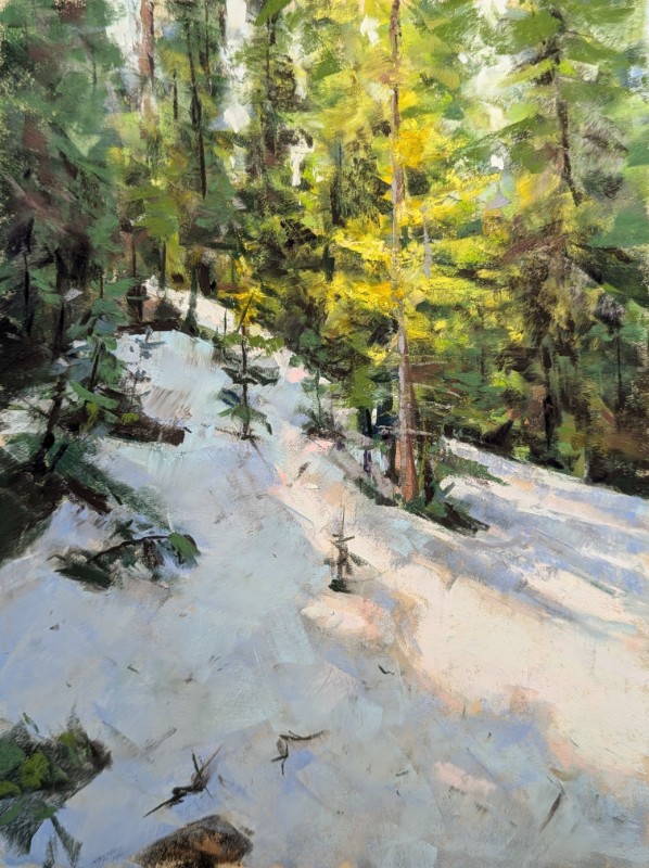 His pastel painting method is equally no-nonsense. He paints small — 9 x 12 inches or under — nearly every day. Since plein air time is scarce, he takes and manipulates his own reference photos on his phone to lock in composition and light before ever approaching the easel. He calls it logging “dust miles.” Consistent, unglamorous, daily effort. It’s working.