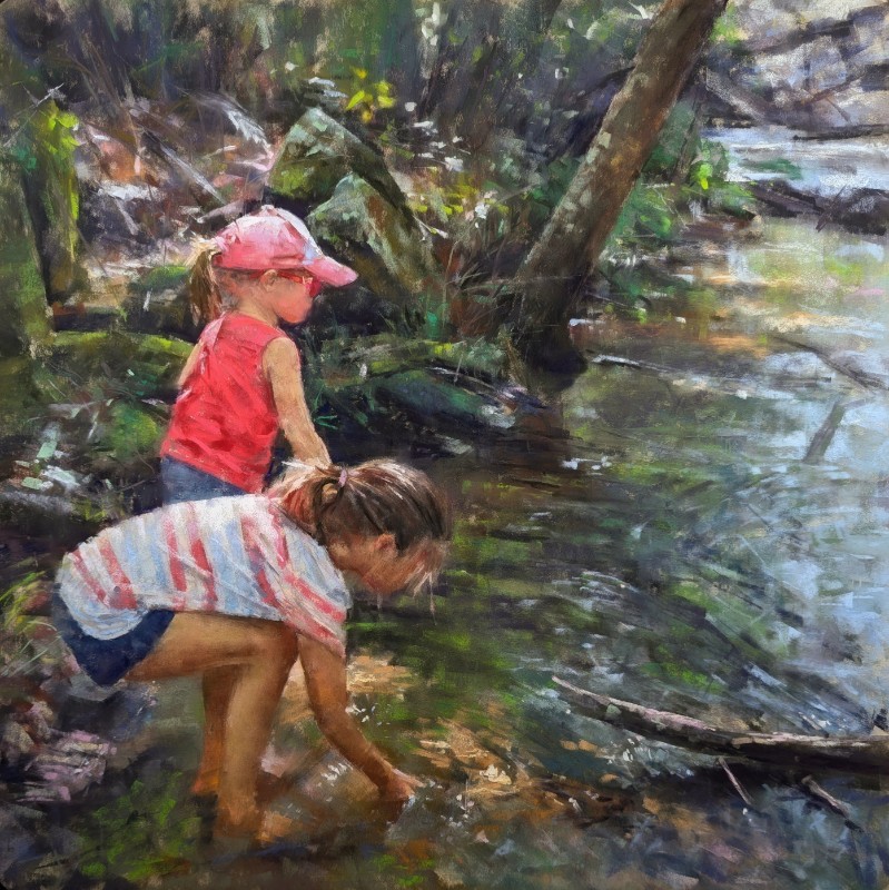 Growing up in the Colorado Rockies and now living near the Ozark Mountains in North Arkansas, Clint paints the kind of landscapes he knows in his bones. His style leans toward tonalism — understated, atmospheric, deceptively quiet. His signature move? A neutral palette where, as he puts it, “the secret is in the grays.” Get those right, and the bold colors sing.